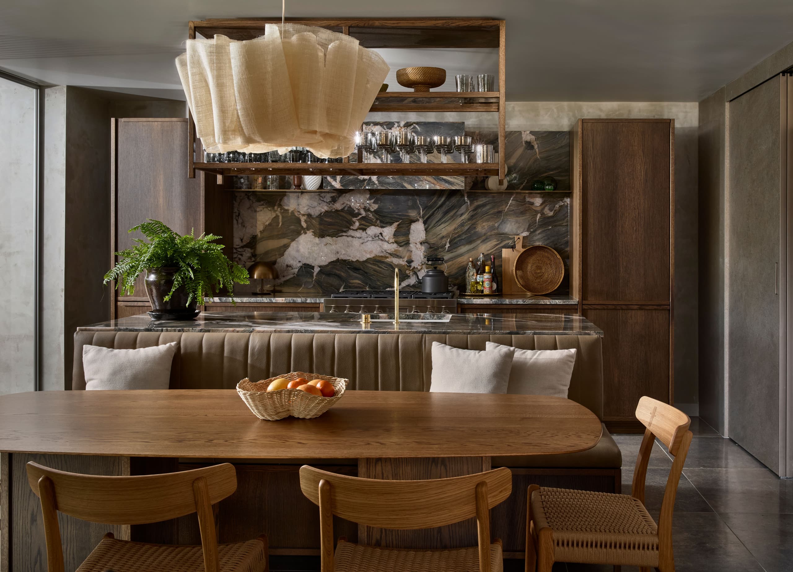 - Natural materials like oak, walnut, and brushed aluminium